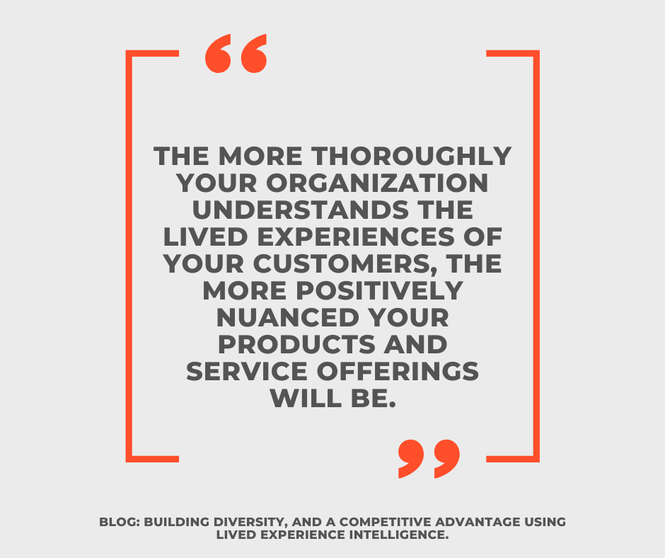 Lived Experience Intelligence (LEI) is not only important to increasing diversity and inclusion in your workplace - it is also essential to gaining a competitive advantage in the market. If your employees have a good understanding of the actual lived experiences of your customers, they will be in a better position to develop new ideas to serve them.